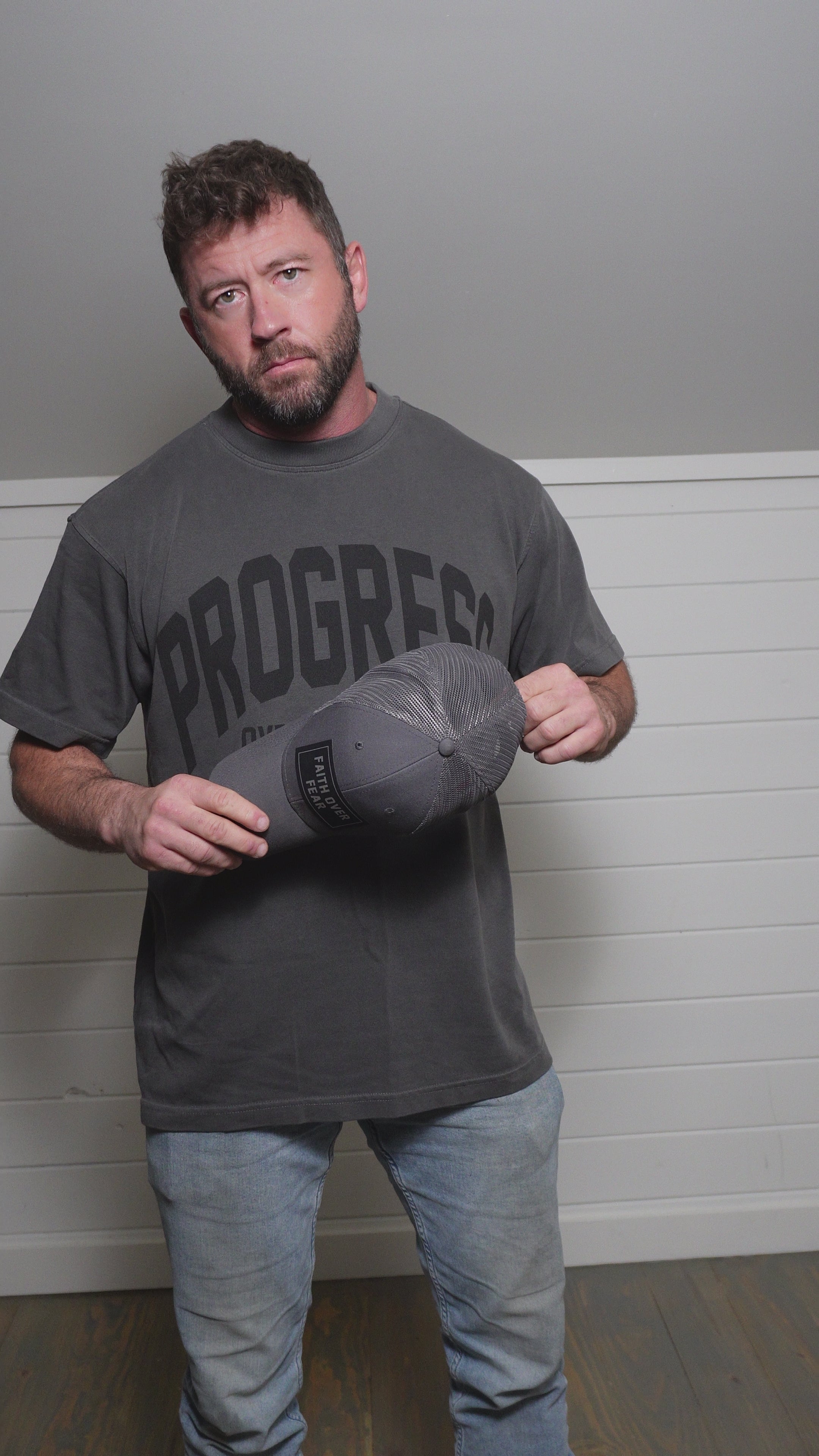 Built for everyday courage β€” this gray trucker hat features a premium leather patch embossed with Faith Over Fear. Designed with a structured front, curved bill, and breathable mesh back for all-day comfort. It’s the reminder you need when the weight gets heavy β€” keep the faith, not the fear.
